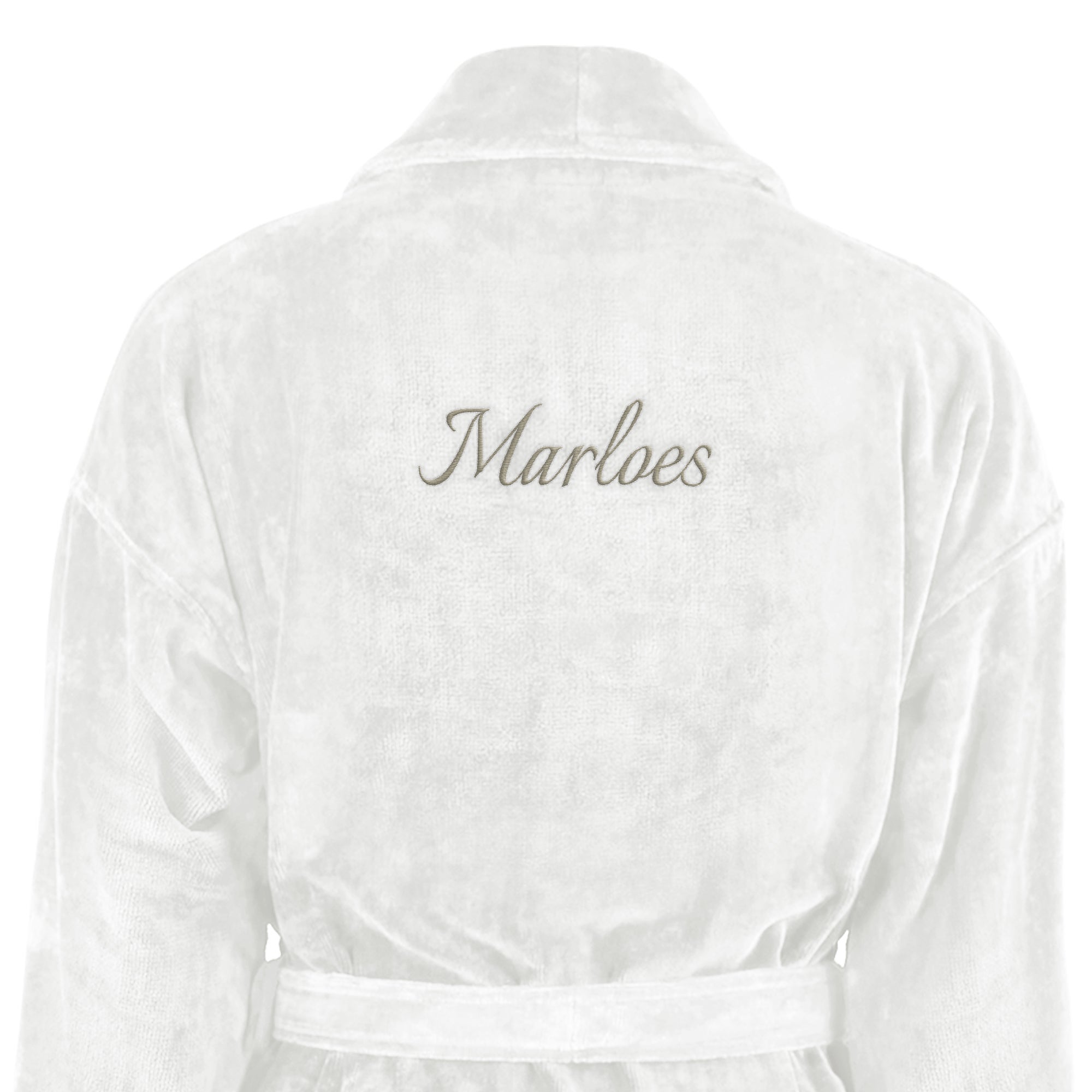Een klassieke badjas voor dames van 100% katoenen badstof (380 gr/m2) met eigen naam geborduurd. Heerlijk om 's ochtends aan te trekken!