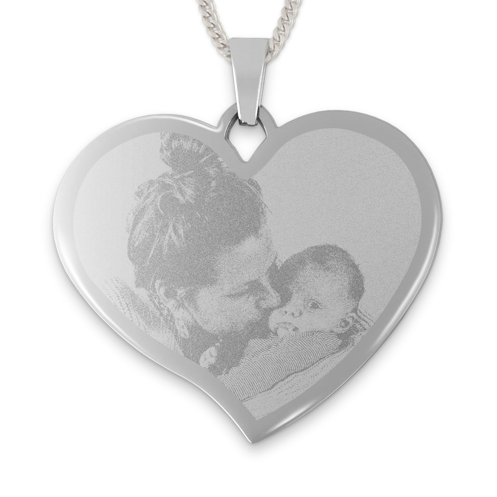 Laat een persoonlijke hartvormige hanger graveren. Anti-allergisch edelstaal met zilverkleurige coating. Een uniek sieraad met foto.