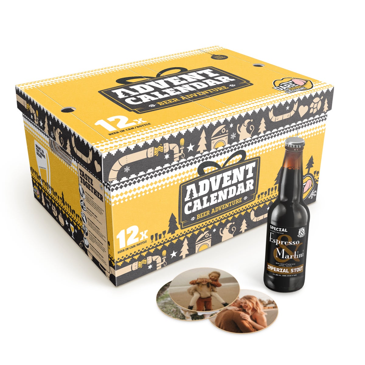 Gepersonaliseerd verrassings bierpakket met jouw foto, tekst en/of logo naar keuze. Gevuld met 12 heerlijke biertjes en 12 unieke bierviltjes!